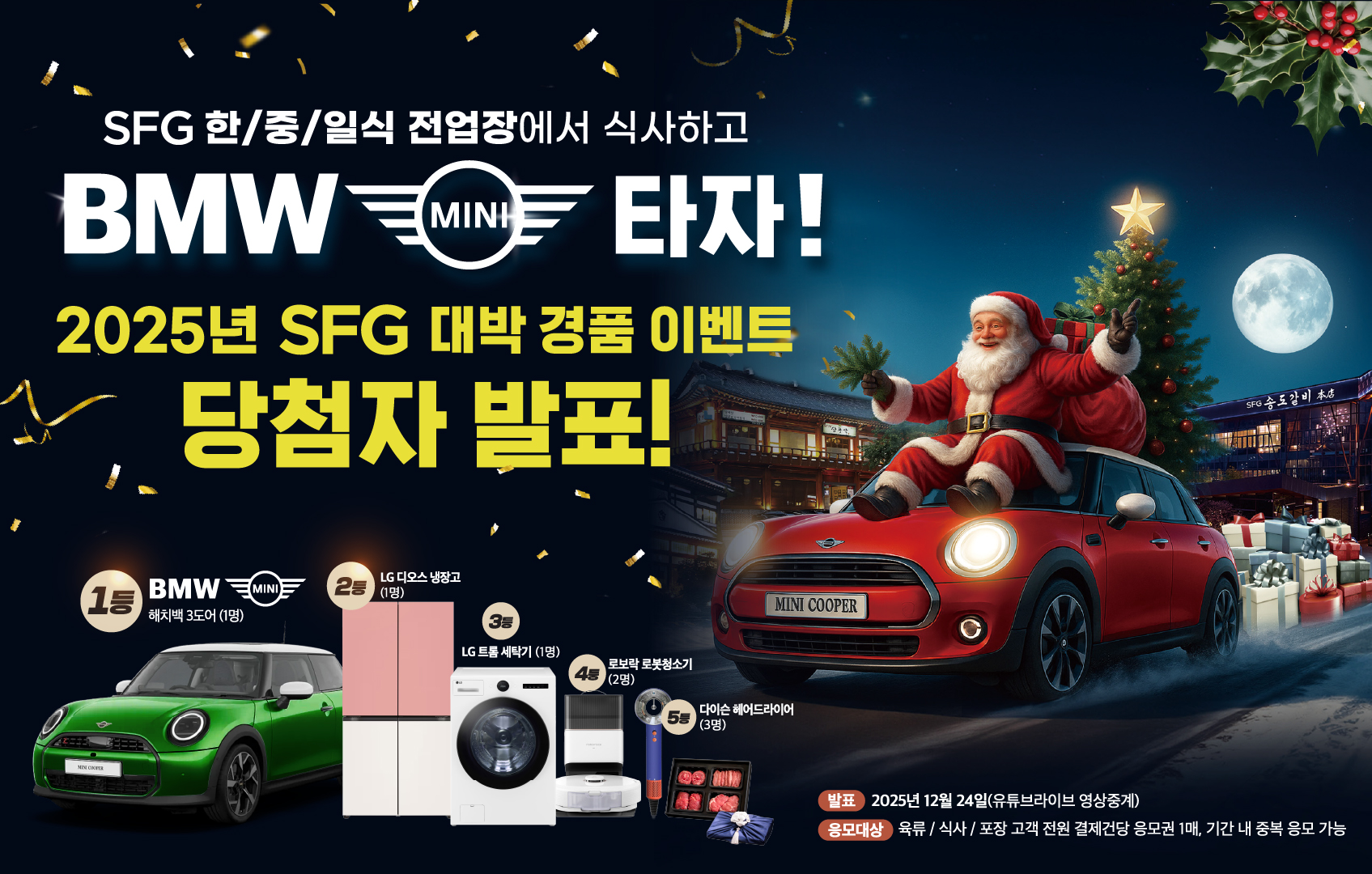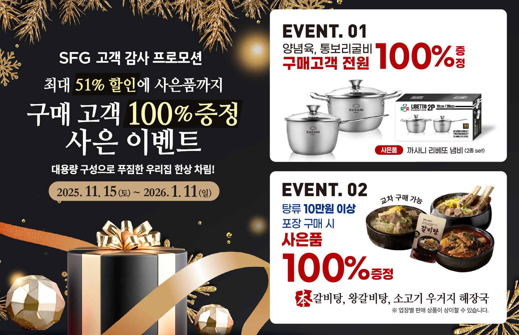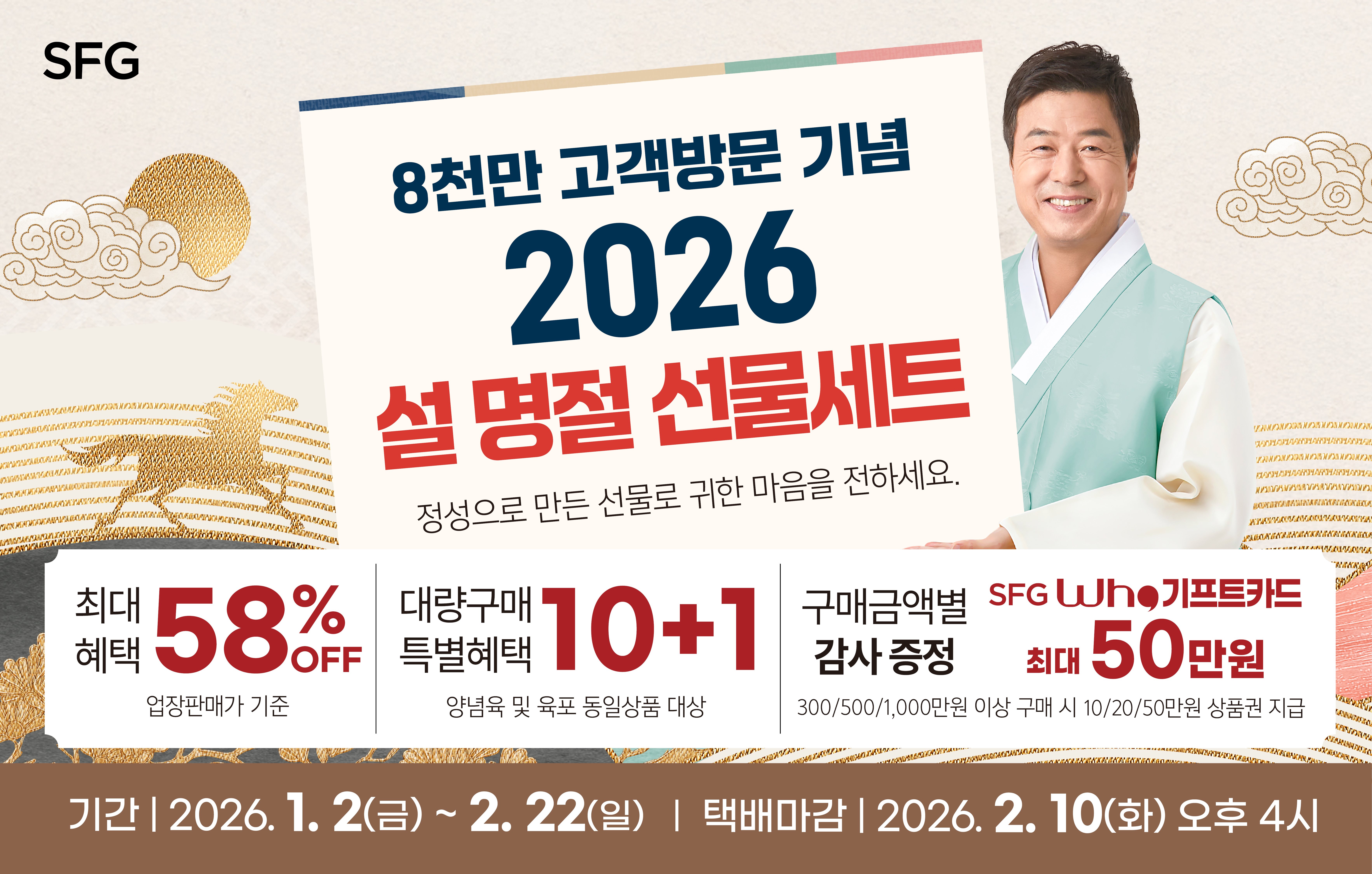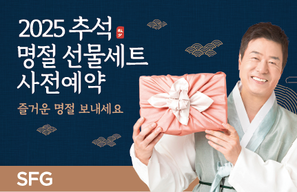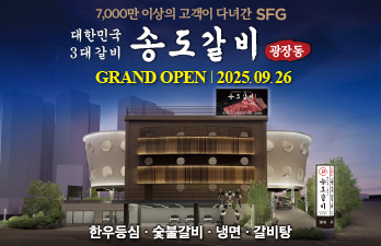 [오픈] SFG Food Village 화정 오픈! 종료 2026.01.21-2026.02.15 조회수:1139 [오픈] 포브스 선정 3대갈비, 송도갈비 인계 오픈 진행중 2026.04.01-2026.05.01 조회수:183 [안내] 2026년 설 연휴 영업 안내 종료 2026.02.04-2026.02.22 조회수:2940 [공지] 2026 SFG 대박 경품 이벤트 시즌2 진행 중 진행중 2026.01.29-2026.12.24 조회수:3006 [프로모션] 2026 설 명절 선물세트 사전예약 종료 2026.01.02-2026.02.22 조회수:6743 [공지] 2025 SFG 대박 경품 이벤트 당첨자 안내 종료 2025.12.24-2025.12.31 조회수:8113 [이벤트] 2025년 대박 경품 이벤트 발표회 종료 2025.12.22-2025.12.25 조회수:1178 [프로모션] SFG&KT '달달혜택' 프로모션 진행 중 종료 2025.11.14-2025.11.30 조회수:2870 [이벤트] SFG 고객 감사 프로모션 종료 2025.11.14-2026.01.11 조회수:1279 WHO Eats Festival – 지금 내 포인트가, 맛있는 한 끼가 됩니다! 종료 2025.10.31-2025.11.30 조회수:5369 [오픈] 대한민국 최강 정통일식, 일본요리 긴자 사당점 오픈 종료 2025.10.31-2025.11.30 조회수:4297 [오픈] 대한민국 3대갈비 송도갈비 광장점 오픈 종료 2025.09.24-2025.10.24 조회수:2925 [오픈] 생선구이 건강 한상, 바다를 먹은 고등어 세종점 오픈 종료 2025.09.10-2025.10.10 조회수:1365 [프로모션] 2025 추석 명절 선물세트 사전예약 종료 2025.08.29-2025.10.12 조회수:7918 [NEW] SFG 신메뉴 출시 이벤트! 종료 2025.07.17-2025.09.30 조회수:10080 [이벤트] 돈블랑 야구 응원 이벤트! 당첨자 발표 종료 2025.07.09-2025.07.09 조회수:858 [오픈] 바다의 생기를 먹음은 생선구이 한상, 바다를먹은 고등어 종료 2025.06.20-2025.07.20 조회수:2655 [이벤트] 돈블랑 야구 응원 이벤트! 종료 2025.06.18-2025.07.02 조회수:1435 [송도갈비 자하문] OPEN 이벤트 당첨자 발표 종료 2025.04.19-2025.04.30 조회수:2283 [이벤트] 2025년 상반기 구매 고객 100% 증정 사은 이벤트 종료 2025.03.22-2025.06.22 조회수:4134 [이벤트] 2025, SFG 대박 경품이벤트 진행 중! 종료 2025.03.08-2025.12.21 조회수:16186 [이벤트] 카카오톡 채널 가입 이벤트 종료 2025.03.08-2025.12.21 조회수:3753 [오픈] 대한민국 3대갈비 송도갈비, 서울 종로시대 선언 종료 2025.02.27-2025.03.28 조회수:2602 [오픈] 청담 연예인 맛집, 돈블랑 수내 상륙! 종료 2025.01.22-2020.02.22 조회수:2418 [오픈] 청담본갈비, 드디어 세종에 상륙하다! 종료 2025.01.17-2025.02.16 조회수:2400 [오픈] 무봉산에서 맛보는 숙성 숯불구이, 자작나무갈비 무봉산 오픈 종료 2024.12.20-2025.01.20 조회수:3196 [이벤트] 2025년 귀한 선물세트 사전예약 진행! 종료 2024.12.19-2025.01.19 조회수:3257 [이벤트] 윈터 홀리데이 미리 크리스마스 이벤트 종료 2024.12.01-2024.12.15 조회수:1704 [오픈] 맑은 물의 신선함을 정성스레 담아낸 일식의 정수, 청담일식 분당 서현 그랜드 오픈 종료 2024.11.26-2024.12.31 조회수:3046 [오픈] 대한민국 대표 중국요리 하인선생, 송도유원지 그랜드 오픈 종료 2024.11.20-2024.12.31 조회수:2819 [이벤트] 2024년 하반기 고객 감사 100% 사은품 증정 이벤트 종료 2024.11.13-2024.12.30 조회수:2275 [오픈] 대한민국 3대 갈비 송도갈비, 광명 밤일맛집거리에 등장하다 종료 2024.11.07-2024.12.07 조회수:3621 [오픈] 대한민국 3대갈비 송도갈비, 서울 창동에 상륙하다! 종료 2024.10.25-2024.11.25 조회수:3593 [이벤트] 뮤지컬 Dear, My 파더 종료 2024.09.24-2024.09.30 조회수:2223 [All New] 최상급을 넘은 숙성 生돼지고깃집 돈블랑 석촌호수 종료 2024.08.22-2024.09.22 조회수:3262 [이벤트] SFG, 2024년 추석 맞이 초특가 할인 행사 진행 중!! 종료 2024.08.10-2024.09.18 조회수:6109 [리뉴얼] 수내역 맛집, 수내 한판등심 리뉴얼 오픈 종료 2024.08.08-2024.09.09 조회수:3861 [오픈] 호수뷰가 아름다운 용인 어비리, 송도갈비 오픈 종료 2024.07.26-2024.08.26 조회수:3990 [오픈] 올림픽공원 줄 서서 먹는 맛집, 송도불고기 오픈 종료 2024.06.01-2024.07.01 조회수:6382 [오픈] 송도불고기 세종, 중흥S클래스 센텀뷰에 GRAND OPEN 종료 2024.05.23-2024.06.24 조회수:6735 [이벤트] 한판등심&송도불고기 먹고 푸짐한 가전 경품 한판 받자! 종료 2024.05.21-2024.12.31 조회수:6822 [이벤트] 고객 감사 100% 증정 사은 이벤트 종료 2024.03.23-2024.05.31 조회수:7769 [이벤트] 히트브랜드 대상 1위 기념 고객 사은 프로모션 종료 2024.03.15-2024.05.20 조회수:7636 [오픈] 한판등심 용인 어비리 오픈 종료 2024.02.07-2024.03.08 조회수:7476 [이벤트] 2024 설맞이 귀한선물세트 사전예약 실시 종료 2024.01.15-2024.02.12 조회수:4310 [오픈] 한판등심 광명 오픈 종료 2024.01.12-2024.02.11 조회수:5523 [오픈] 푸드빌리지 세종 한판등심 오픈 종료 2024.01.05-2024.02.05 조회수:4280 [오픈] 인천 영종도, 송도갈비 오픈 종료 2023.12.19-2024.01.18 조회수:4052 [오픈] 푸드빌리지 세종 더:봉팡 오픈 종료 2023.12.17-2024.01.17 조회수:5250 [확장오픈] 청담 블루 긴자 코스요리 전문관 확장 오픈 종료 2023.12.12-2024.01.12 조회수:2548
