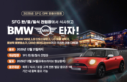 Event [오픈] SFG Food Village 화정 오픈! 종료 2026.01.21-2026.02.15 조회수:1139 [오픈] 포브스 선정 3대갈비, 송도갈비 인계 오픈 진행중 2026.04.01-2026.05.01 조회수:183 [안내] 2026년 설 연휴 영업 안내 종료 2026.02.04-2026.02.22 조회수:2940 [공지] 2026 SFG 대박 경품 이벤트 시즌2 진행 중 진행중 2026.01.29-2026.12.24 조회수:3006 [프로모션] 2026 설 명절 선물세트 사전예약 종료 2026.01.02-2026.02.22 조회수:6743 [공지] 2025 SFG 대박 경품 이벤트 당첨자 안내 종료 2025.12.24-2025.12.31 조회수:8113 [이벤트] 2025년 대박 경품 이벤트 발표회 종료 2025.12.22-2025.12.25 조회수:1178 [프로모션] SFG&KT '달달혜택' 프로모션 진행 중 종료 2025.11.14-2025.11.30 조회수:2870 [이벤트] SFG 고객 감사 프로모션 종료 2025.11.14-2026.01.11 조회수:1279 WHO Eats Festival – 지금 내 포인트가, 맛있는 한 끼가 됩니다! 종료 2025.10.31-2025.11.30 조회수:5369 [오픈] 대한민국 최강 정통일식, 일본요리 긴자 사당점 오픈 종료 2025.10.31-2025.11.30 조회수:4297 [오픈] 대한민국 3대갈비 송도갈비 광장점 오픈 종료 2025.09.24-2025.10.24 조회수:2925 [오픈] 생선구이 건강 한상, 바다를 먹은 고등어 세종점 오픈 종료 2025.09.10-2025.10.10 조회수:1365 [프로모션] 2025 추석 명절 선물세트 사전예약 종료 2025.08.29-2025.10.12 조회수:7918 [NEW] SFG 신메뉴 출시 이벤트! 종료 2025.07.17-2025.09.30 조회수:10080 [이벤트] 돈블랑 야구 응원 이벤트! 당첨자 발표 종료 2025.07.09-2025.07.09 조회수:858 [오픈] 바다의 생기를 먹음은 생선구이 한상, 바다를먹은 고등어 종료 2025.06.20-2025.07.20 조회수:2655 [이벤트] 돈블랑 야구 응원 이벤트! 종료 2025.06.18-2025.07.02 조회수:1435 [송도갈비 자하문] OPEN 이벤트 당첨자 발표 종료 2025.04.19-2025.04.30 조회수:2283 [이벤트] 2025년 상반기 구매 고객 100% 증정 사은 이벤트 종료 2025.03.22-2025.06.22 조회수:4134 [이벤트] 2025, SFG 대박 경품이벤트 진행 중! 종료 2025.03.08-2025.12.21 조회수:16186 [이벤트] 카카오톡 채널 가입 이벤트 종료 2025.03.08-2025.12.21 조회수:3753 [오픈] 대한민국 3대갈비 송도갈비, 서울 종로시대 선언 종료 2025.02.27-2025.03.28 조회수:2602 [오픈] 청담 연예인 맛집, 돈블랑 수내 상륙! 종료 2025.01.22-2020.02.22 조회수:2418 [오픈] 청담본갈비, 드디어 세종에 상륙하다! 종료 2025.01.17-2025.02.16 조회수:2400 [오픈] 무봉산에서 맛보는 숙성 숯불구이, 자작나무갈비 무봉산 오픈 종료 2024.12.20-2025.01.20 조회수:3196 [이벤트] 2025년 귀한 선물세트 사전예약 진행! 종료 2024.12.19-2025.01.19 조회수:3257 [이벤트] 윈터 홀리데이 미리 크리스마스 이벤트 종료 2024.12.01-2024.12.15 조회수:1704 [오픈] 맑은 물의 신선함을 정성스레 담아낸 일식의 정수, 청담일식 분당 서현 그랜드 오픈 종료 2024.11.26-2024.12.31 조회수:3046 [오픈] 대한민국 대표 중국요리 하인선생, 송도유원지 그랜드 오픈 종료 2024.11.20-2024.12.31 조회수:2819 [이벤트] 2024년 하반기 고객 감사 100% 사은품 증정 이벤트 종료 2024.11.13-2024.12.30 조회수:2275 [오픈] 대한민국 3대 갈비 송도갈비, 광명 밤일맛집거리에 등장하다 종료 2024.11.07-2024.12.07 조회수:3621 [오픈] 대한민국 3대갈비 송도갈비, 서울 창동에 상륙하다! 종료 2024.10.25-2024.11.25 조회수:3593 [이벤트] 뮤지컬 Dear, My 파더 종료 2024.09.24-2024.09.30 조회수:2223 [All New] 최상급을 넘은 숙성 生돼지고깃집 돈블랑 석촌호수 종료 2024.08.22-2024.09.22 조회수:3262 [이벤트] SFG, 2024년 추석 맞이 초특가 할인 행사 진행 중!! 종료 2024.08.10-2024.09.18 조회수:6109 [리뉴얼] 수내역 맛집, 수내 한판등심 리뉴얼 오픈 종료 2024.08.08-2024.09.09 조회수:3861 [오픈] 호수뷰가 아름다운 용인 어비리, 송도갈비 오픈 종료 2024.07.26-2024.08.26 조회수:3990 [오픈] 올림픽공원 줄 서서 먹는 맛집, 송도불고기 오픈 종료 2024.06.01-2024.07.01 조회수:6382 [오픈] 송도불고기 세종, 중흥S클래스 센텀뷰에 GRAND OPEN 종료 2024.05.23-2024.06.24 조회수:6735 [이벤트] 한판등심&송도불고기 먹고 푸짐한 가전 경품 한판 받자! 종료 2024.05.21-2024.12.31 조회수:6822 [이벤트] 고객 감사 100% 증정 사은 이벤트 종료 2024.03.23-2024.05.31 조회수:7769 [이벤트] 히트브랜드 대상 1위 기념 고객 사은 프로모션 종료 2024.03.15-2024.05.20 조회수:7636 [오픈] 한판등심 용인 어비리 오픈 종료 2024.02.07-2024.03.08 조회수:7476 [이벤트] 2024 설맞이 귀한선물세트 사전예약 실시 종료 2024.01.15-2024.02.12 조회수:4310 [오픈] 한판등심 광명 오픈 종료 2024.01.12-2024.02.11 조회수:5523 [오픈] 푸드빌리지 세종 한판등심 오픈 종료 2024.01.05-2024.02.05 조회수:4280 [오픈] 인천 영종도, 송도갈비 오픈 종료 2023.12.19-2024.01.18 조회수:4052 [오픈] 푸드빌리지 세종 더:봉팡 오픈 종료 2023.12.17-2024.01.17 조회수:5250 [확장오픈] 청담 블루 긴자 코스요리 전문관 확장 오픈 종료 2023.12.12-2024.01.12 조회수:2548 1234